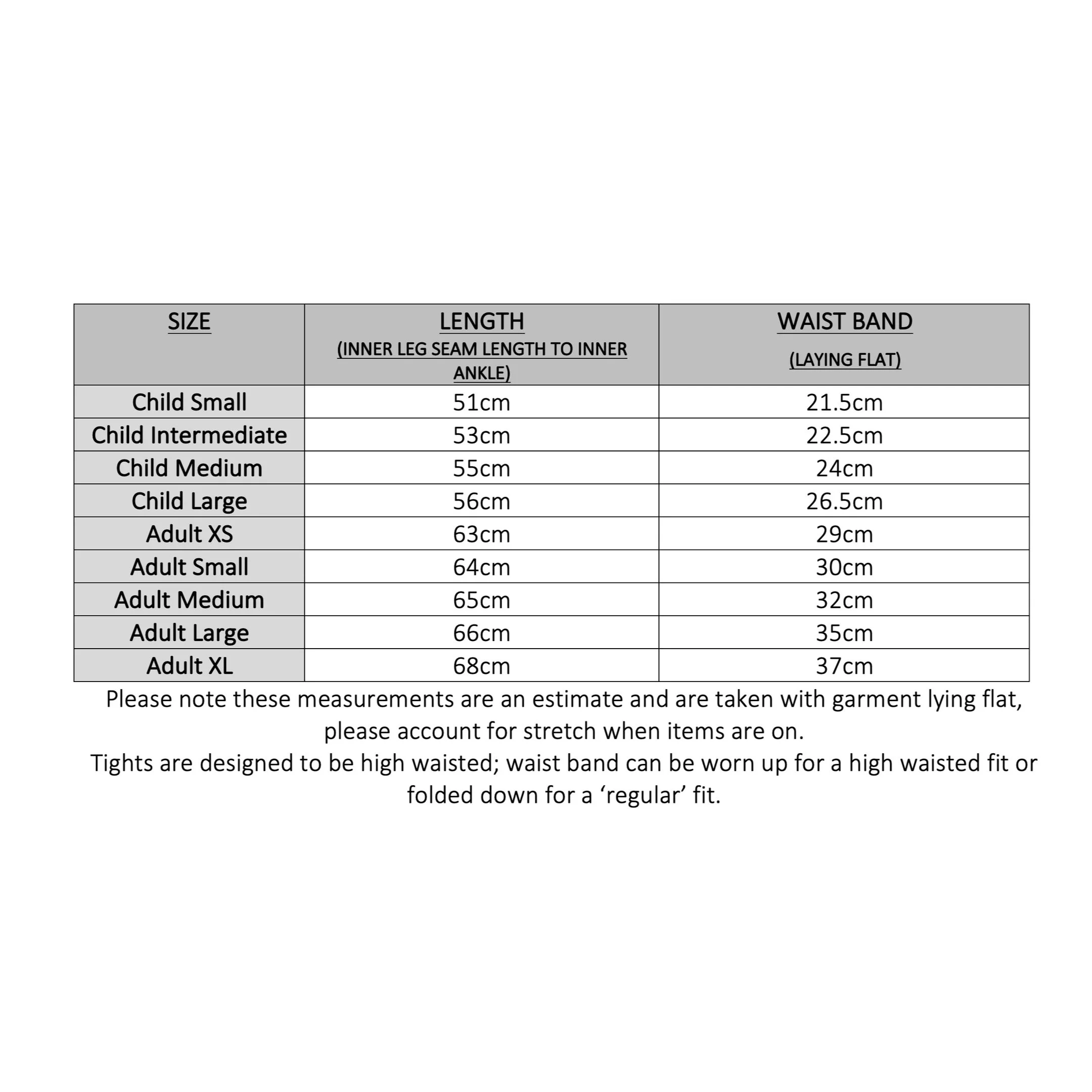 High waisted full length tights. Waist band can be worn up for a high waisted fit or folded down for a ‘regular’ fit.